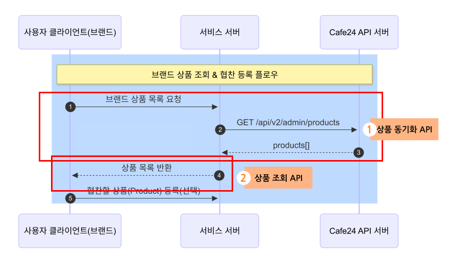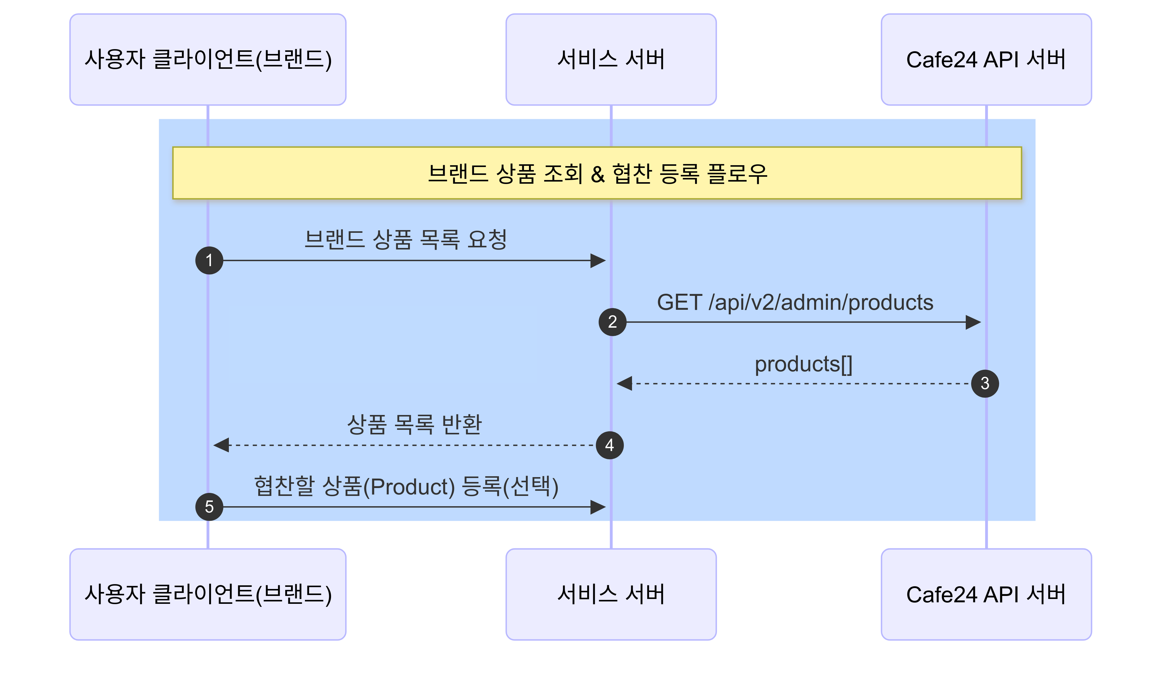 - 상품 조회: 브랜드가 우리 서비스에서 자사 상품 목록을 보고 등록할 협찬 상품을 고를 수 있도록 Cafe24 상품 조회 API을 읽어온다.
