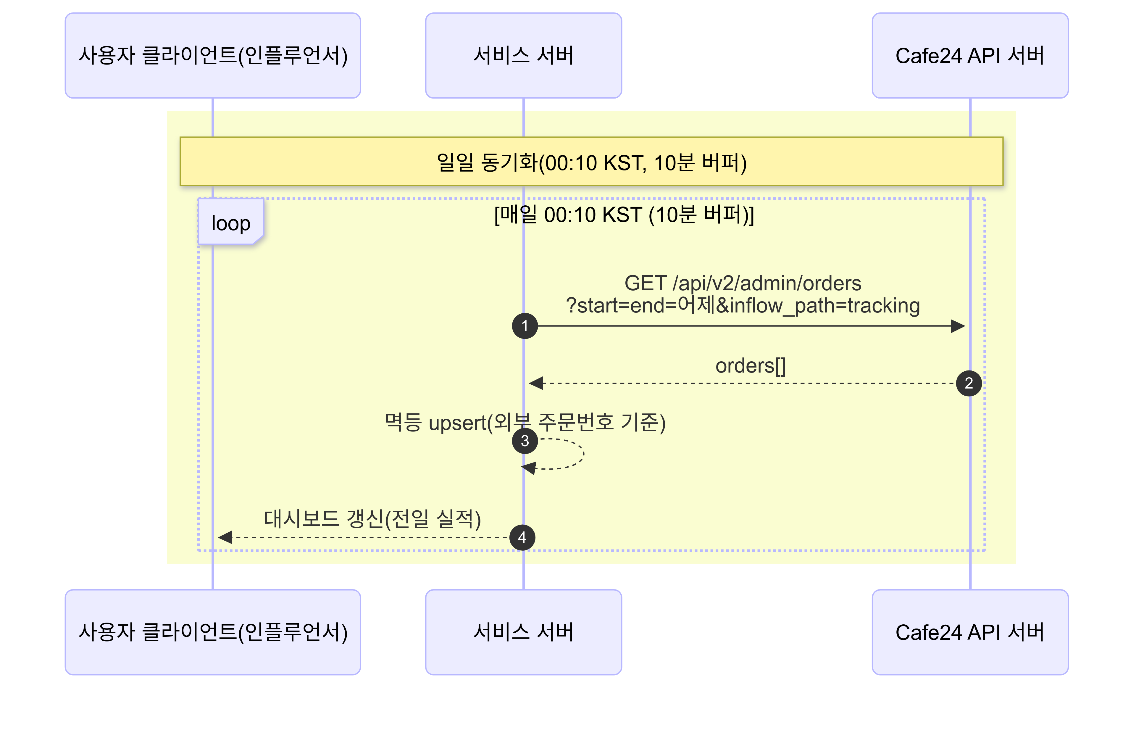 - 주문 조회: 매일 00:10에 전일 주문을 모아서 동기화한다.