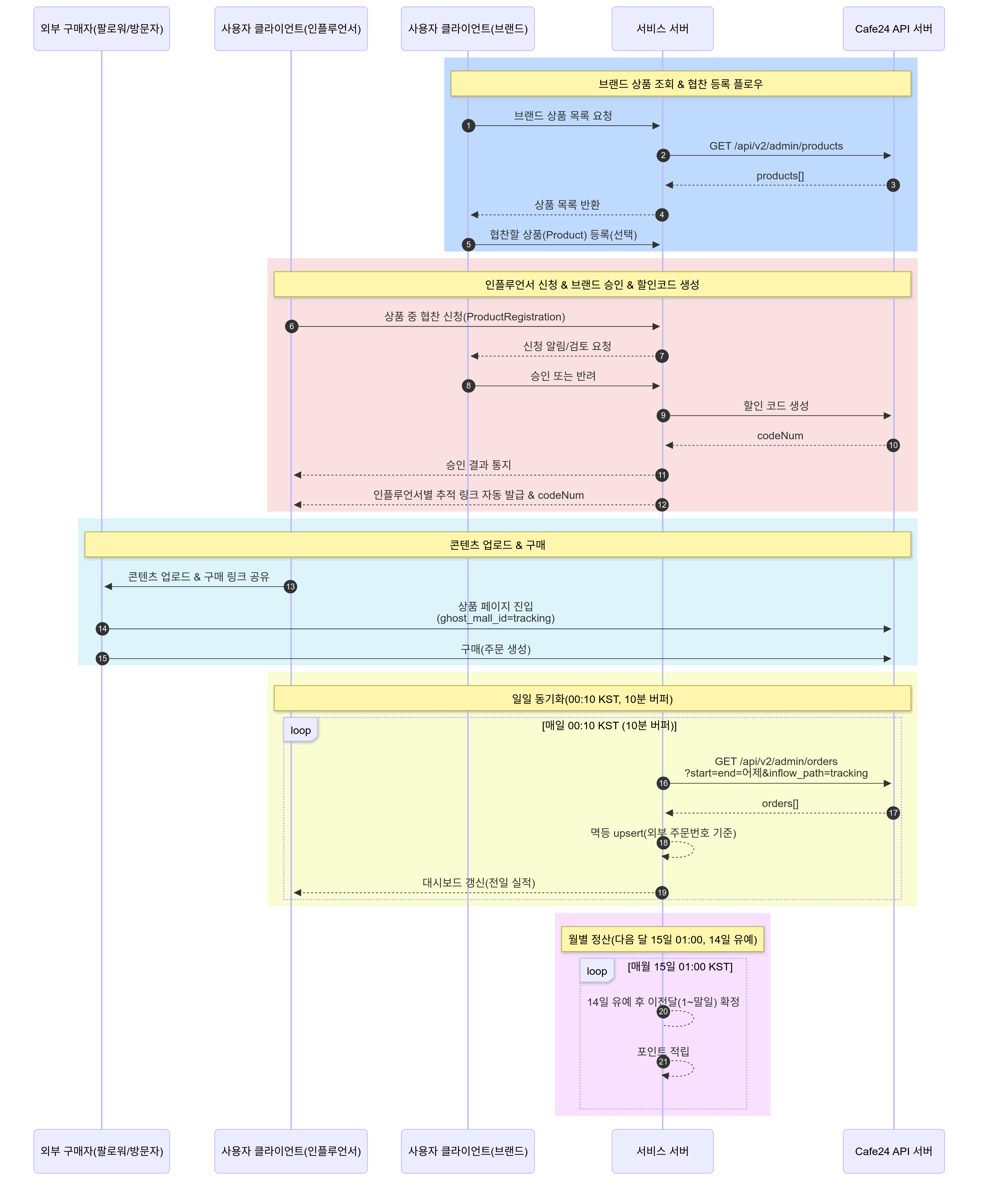 이전 포스팅에서도 적었지만 위 사진은 우리의 큰 비즈니스 플로우이다. (다른 부분들은 다 제외하고 외부 API 활용 기준으로 그려봤다.) 우리 서비스는 사실상 브랜드가 이용하는 서비스 하나, 인플루언서가 이용하는 서비스 총 2개로 나눠져 있고, 이때 우리는 Cafe24라는 외부 API를 활용해서 보다 쉽게 둘을 연결해 주는데 도움을 준다.