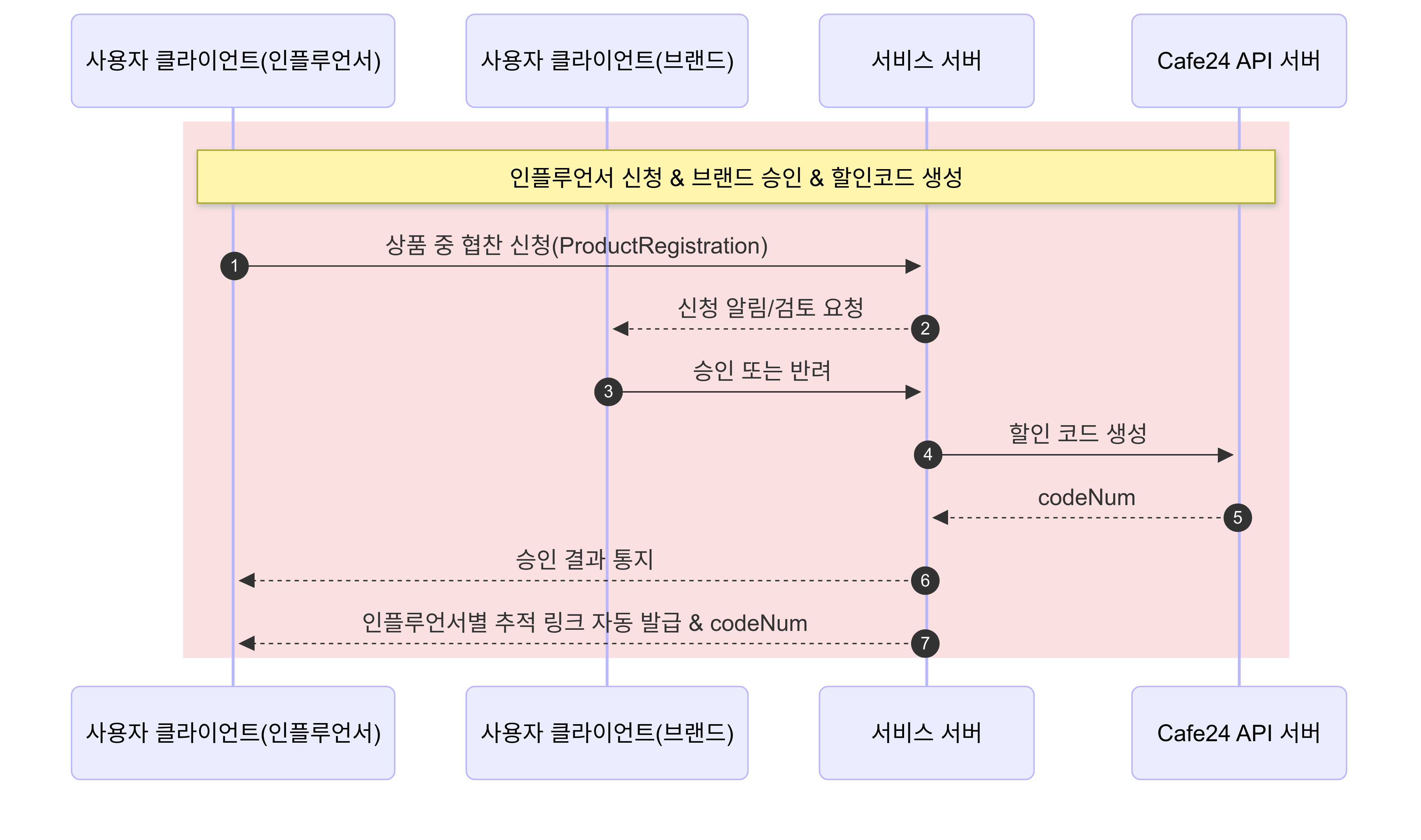 이 API는 협찬 승인 시 인플루언서별 할인 코드를 Cafe24에 발급하기 위해 호출된다. 단순 조회가 아닌 쓰기이므로 더 민감하다.
