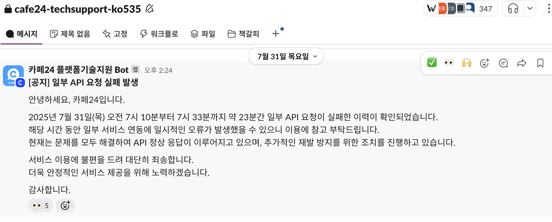 실제 Cafe24 기술지원 Slack에도 서버 오류 공지가 종종 올라온다. 최근에도 비슷한 이슈가 있었고, 이런 순간 우리 쪽 해당 기능들이 아예 동작하지 않으면서, 크게 서비스의 문제로 이어지게 됐다.