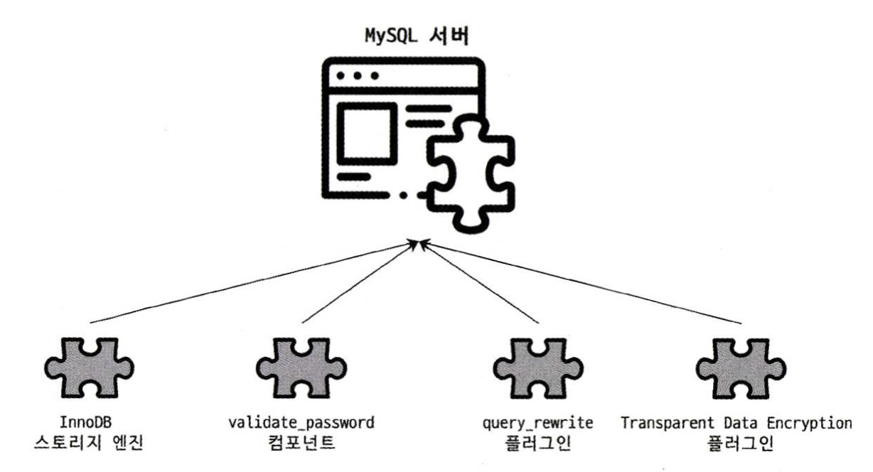 플러그인 모델은 MySQL의 독특한 구조 중 하나이다. 플러그인 해서 사용할 수 있는 것이 스토리지 엔진만 있는 것은 아니다. 전문 검색 엔진을 위한 검색어 파서(인덱싱할 키워드를 분리해 내는 작업)도 플러그인 형태로 개발해서 사용할 수 있고, 사용자 인증을 위한 Native Caching SHA-2 Authentication 등 도 모두 플러그인으로 구현되어 제공된다.