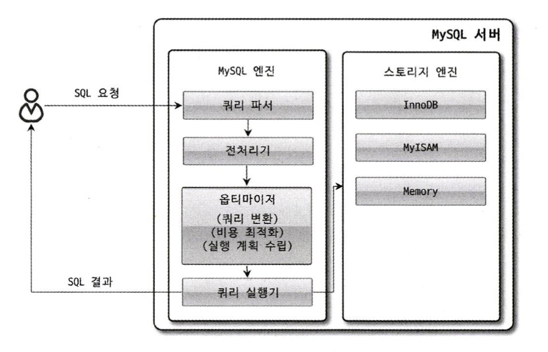 MySQL 엔진은 클라이언트로부터 접속 및 쿼리 요청을 처리하는 커넥션 핸들러와 SQL 파서 및 전처리기, 쿼리의 최적화된 실행을 위한 옵티마이저가 중심을 이룬다.