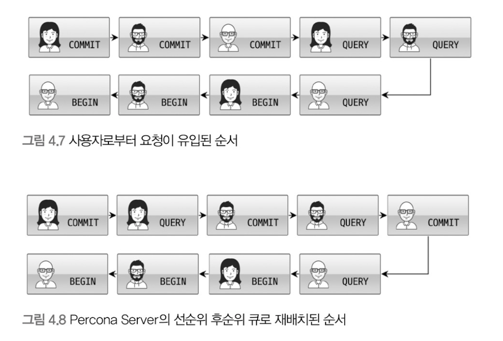 Percona Server의 스레드 풀 플러그인은 선순위 큐와 후순위 큐를 이용해 특정 트랜잭션이나 쿼리를 우선적으로 처리할 수 있는 기능도 있다. 이렇게 먼저 시작된 트랜잭션 내에 속한 SQL을 빨리 처리해 주면 해당 트랜잭션을 가지고 있던 잠금이 빨리 해제되고, 잠금 경합을 낮춰서 전체적으로 처리 성능을 향상시킬 수 있다.